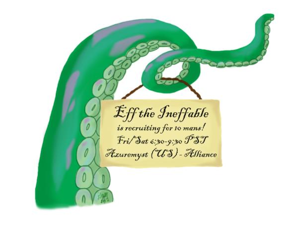 In case you don't hang on every tweet Nymphy and I send out Eff the Ineffable is recruiting for MoP. We have enough hybrid classes that we can accommodate pretty much anyone, but we are particularly looking for players who can tank or heal (or both!).